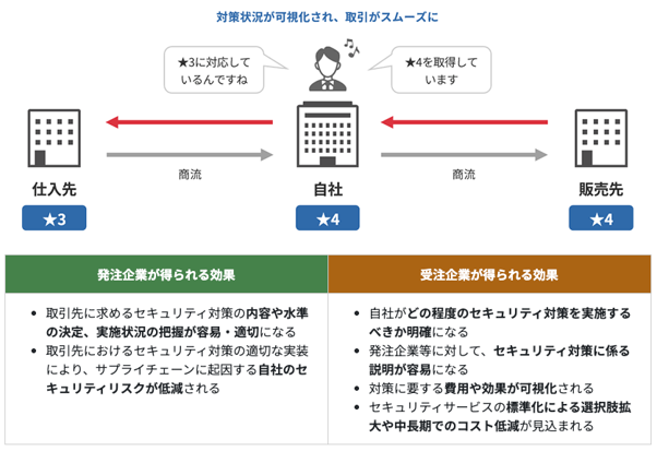 制度の核になるのは、企業のセキュリティ対策の程度を新しい制度によって「★1」から「★5」のレベルにカテゴライズしていくというものです。こうすれば、企業が取引先を選定する際にも役に立ちますし、物流の中流にいる企業も、上からの問い合わせに対応しやすくなります。