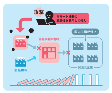 たとえば、ある企業がサイバー攻撃を受けると、その影響が取引先や関連企業にまで波及し、業務停止を招く「サイバードミノ」と呼ばれる事態を引き起こしてしまうこともあります(図1)。*4
