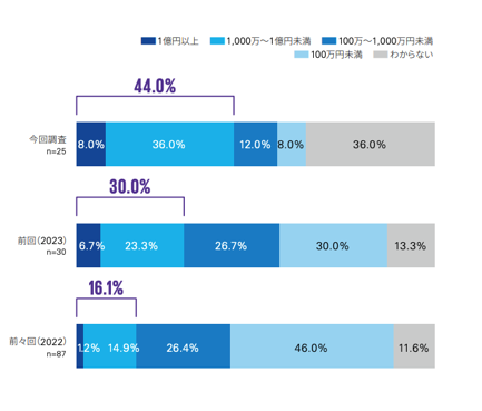 2025年に国内企業を対象に実施された調査によると、1年間でサイバーインシデントによる被害額が1,000万円以上となった企業が、約44%にのぼりました。