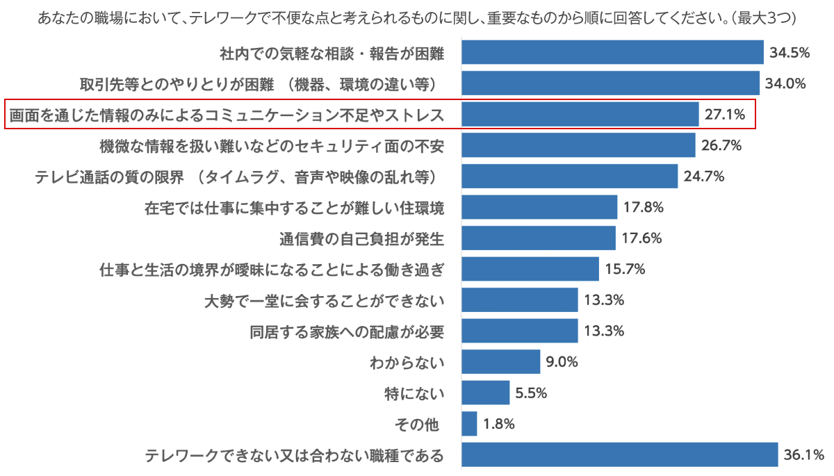 さらに「社内での気軽な相談・報告が困難」「取引先等とのやりとりが困難」と感じる人は、それぞれ3割を超えていることがわかります。
