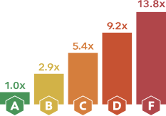 Security Scorecardによる統計では、レイティングが低い組織はサイバー攻撃による侵害を受けるリスクがAランクの企業に比べてBで2.9倍、Cで5.4倍、Dで9.2倍、Fで13.8倍高いと示されています。