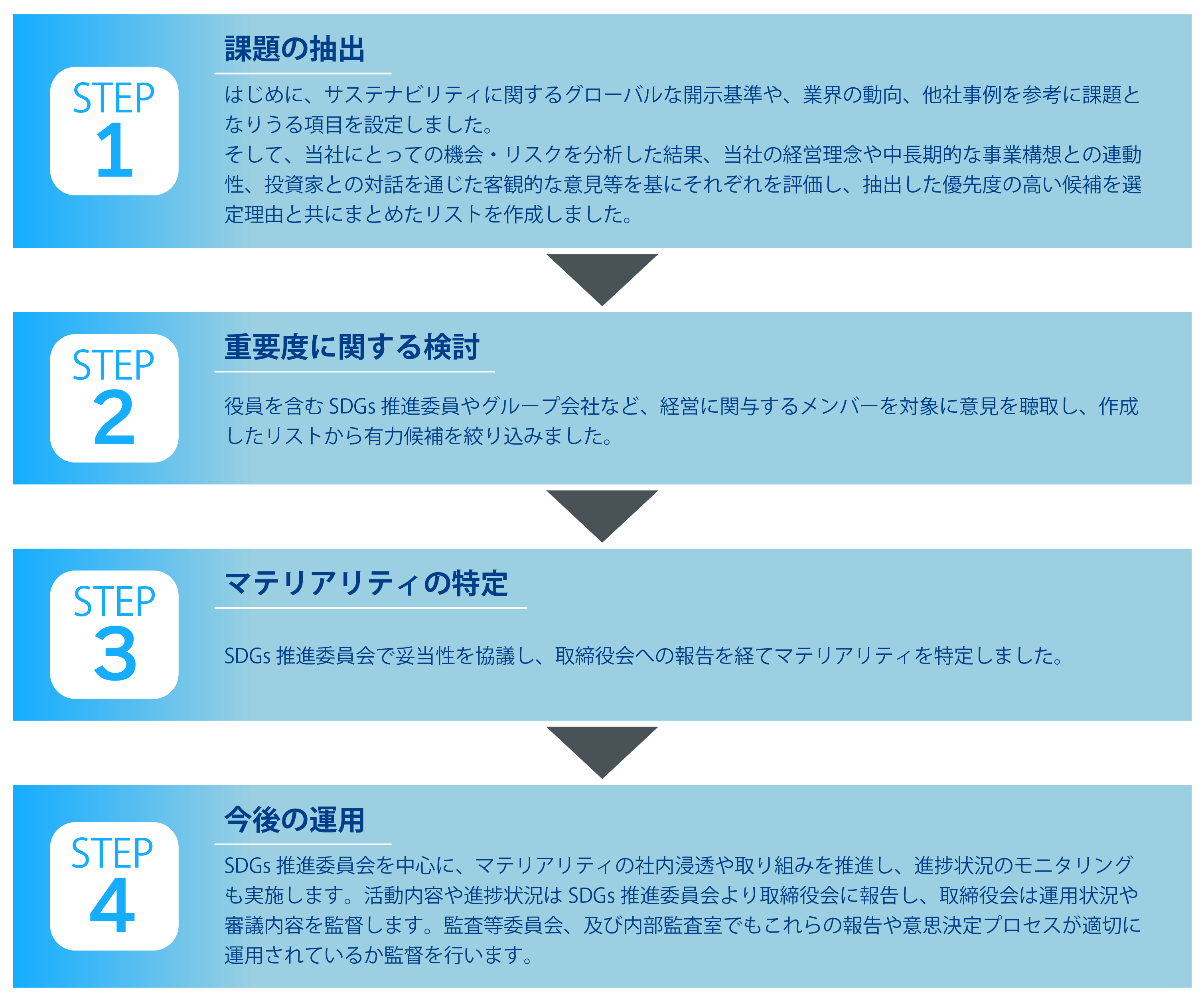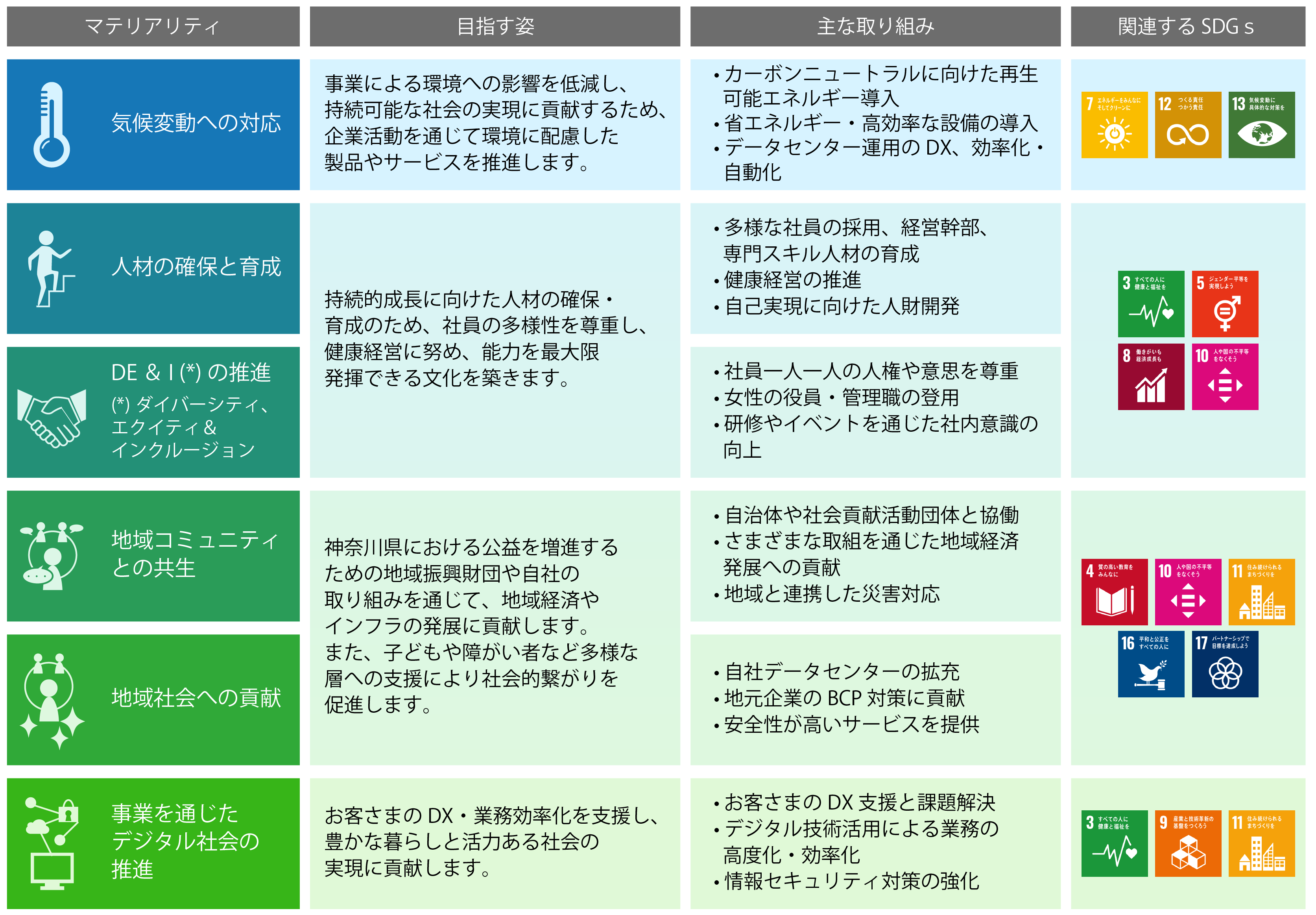 当社グループは、多彩な人材と情報技術やサービスを通じて、経済価値、社会価値、環境価値を創出し、様々なステークホルダーの皆様と共に豊かな社会づくりに尽力すべく、2040年を目標年とするマテリアリティを2025年7月に策定しました。2040年は、当社グループにおけるカーボンニュートラル実現の目標年であり、「気候変動への対応」を含む6つのマテリアリティは、経営計画に紐づく重要課題としても位置付けています。さらに成長を続ける企業であり続けるために、本マテリアリティに取り組んでいます。